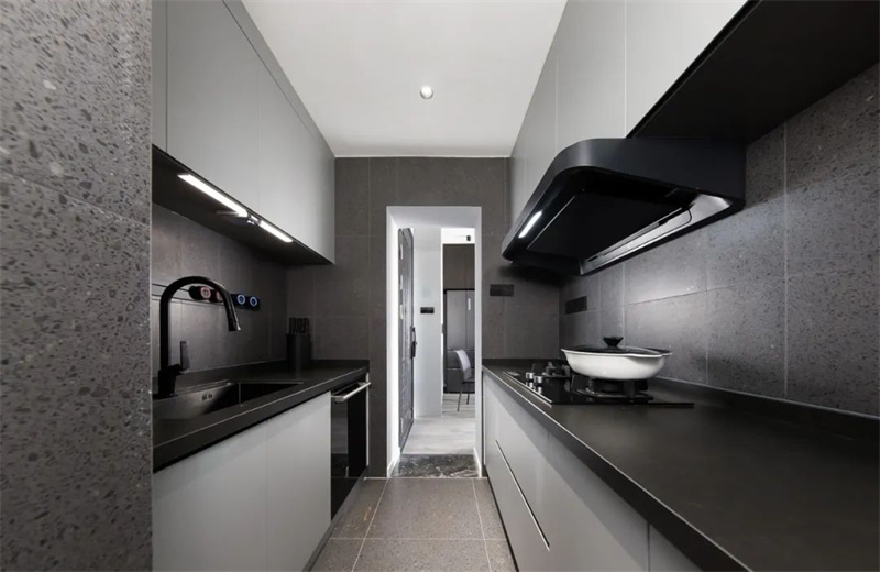 厨房是一个完美的结合了功能性和美学的空间。清洁的线条和简约的设计元素在这里主导,灰色的定制橱柜提供了充足的储存空间,同时保持了整个空间的干净度。智能灯光和智能厨房电器的使用,提高了生活的便利性,为业主打造一个理想的烹饪空间。