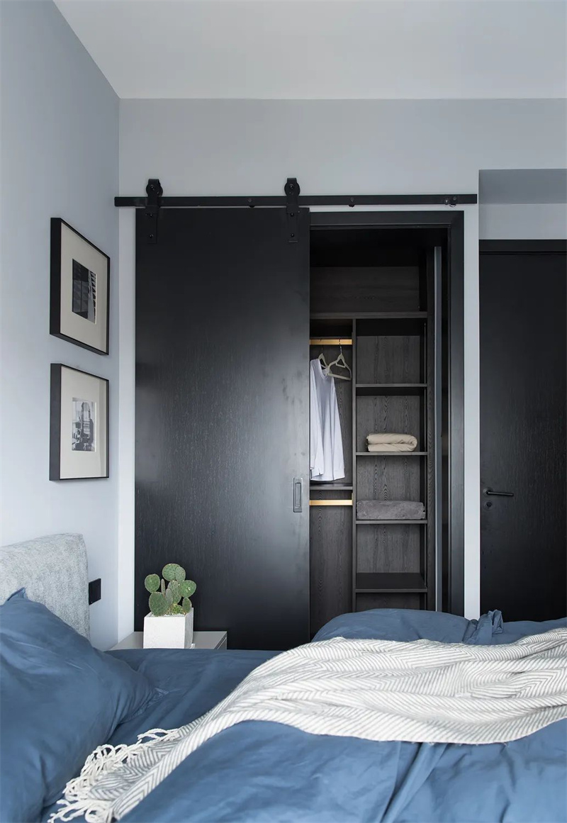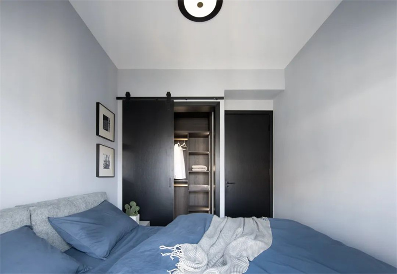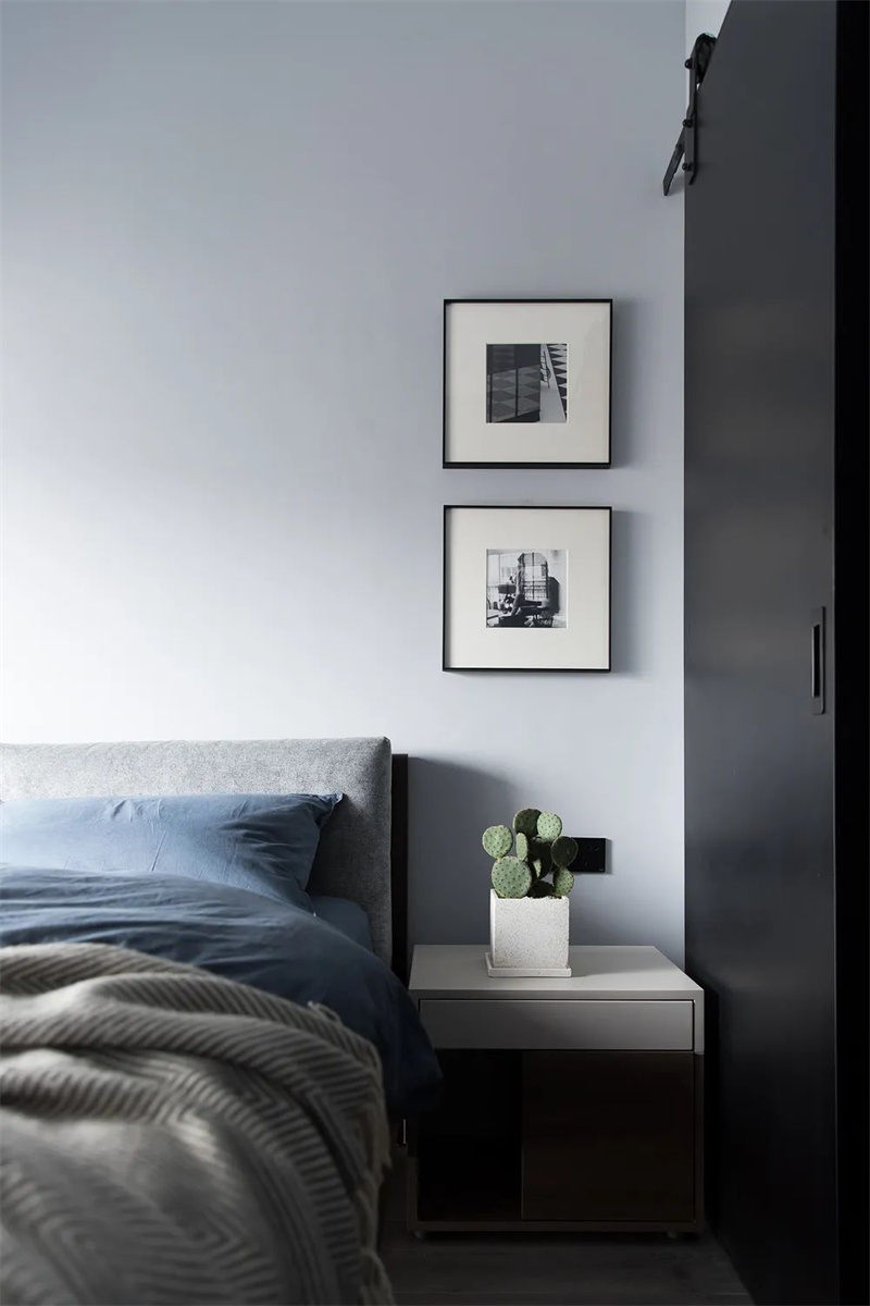 主卧室延续了整体的极简风格,以浅灰色和白色的搭配为主,消除了多余的装饰元素。深色的定制柜和蓝灰色的床品为卧室注入了宁静的舒适感。通过精心设计的照明,卧室的空间质感和氛围得以突显,使简洁的设计与窗外的自然景色相得益彰。