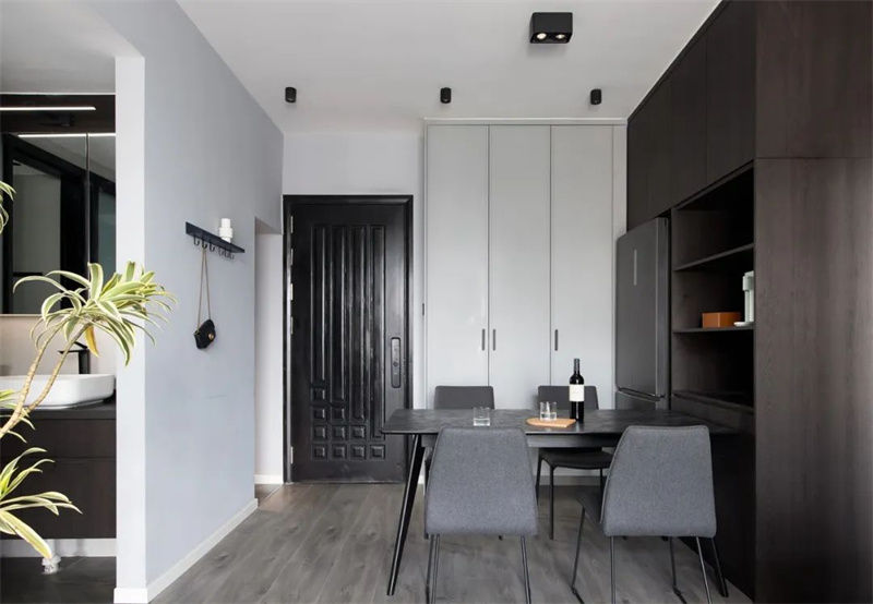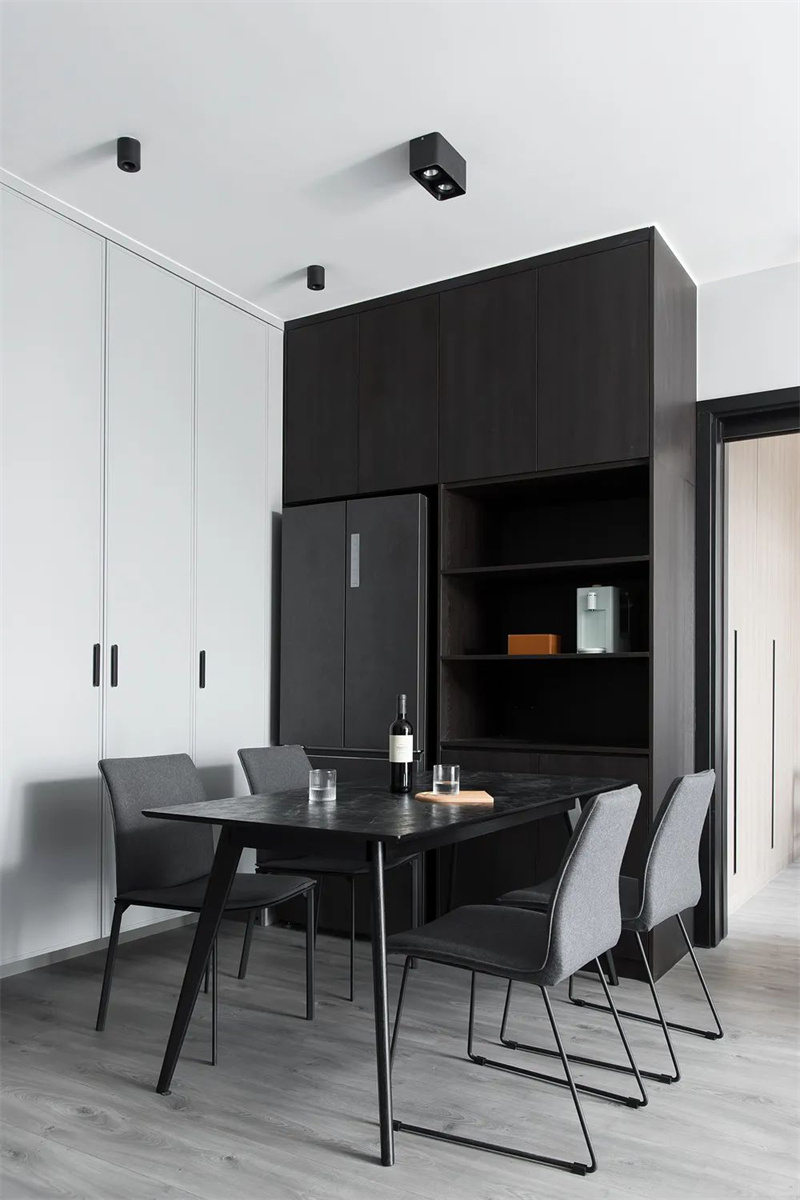 餐厅延续了整体的简约优雅设计风格,以黑色大理石台面的餐桌为中心,配以灰色布艺餐椅。旁边的餐边柜和嵌入式冰箱完美融合,使整个空间显得清新、简约和宽敞舒适。