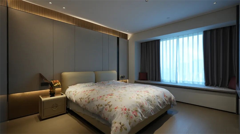 主卧整体色调沉稳柔和,灰色软包背景墙搭配木饰线条与隐藏式灯带,营造出静谧而高级的睡眠氛围。米色皮质大床配花卉图案床品,增添一抹自然柔美,让空间更具温度。一侧开放式衣柜与嵌入式收纳结合,满足衣物与饰品的分类存放需求,兼顾美观与实用性,打造一个整洁有序的私密空间。