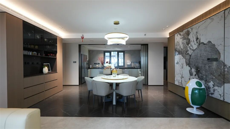 餐厅延续整体现代轻奢风格,圆形大理石餐桌搭配浅色皮质餐椅,简洁大气又不失温馨。地面采用深色大理石瓷砖,与浅色墙面形成对比,提升空间层次感。一侧整墙储物柜兼具酒柜与展示功能,玻璃门设计让藏品一目了然,实用又美观。