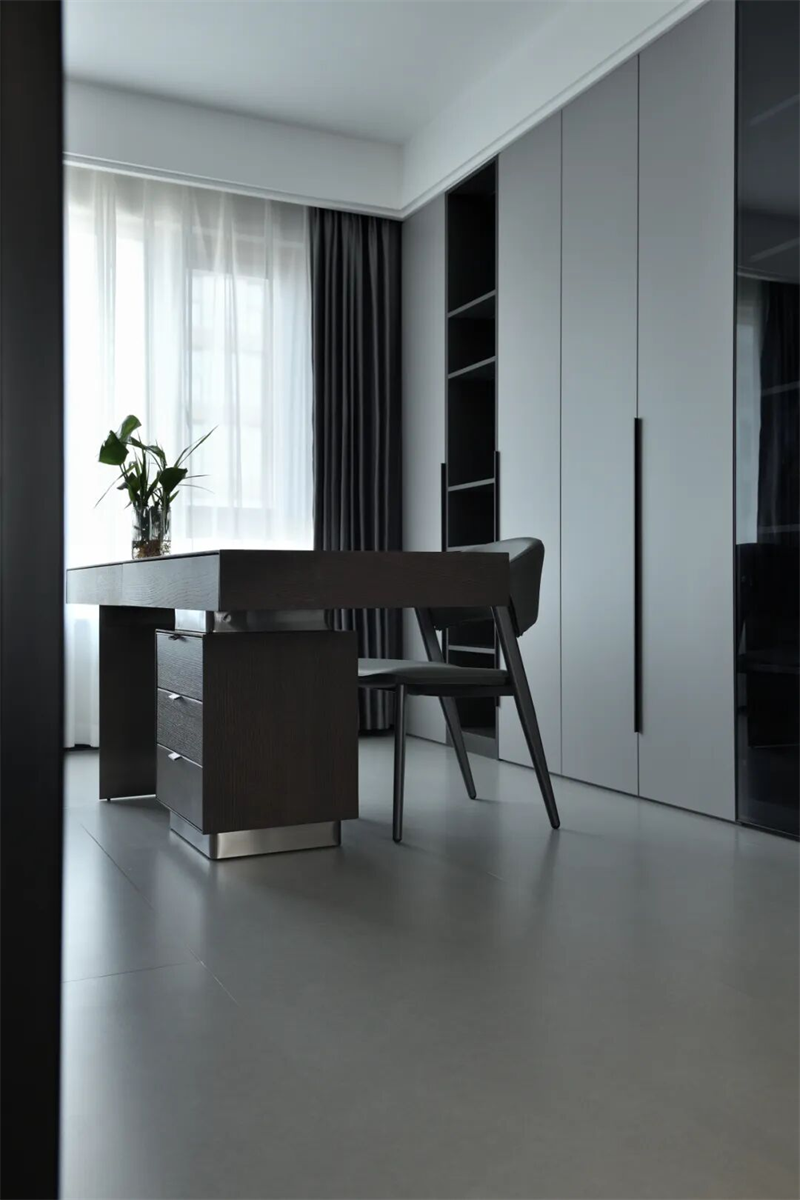 书房空间通透宁静,以灰白为主调。黑色金属框玻璃门隔断,既保证私密性,又不影响采光与视线通透。室内地面铺设灰色哑光地砖,墙面简洁无饰,突出空间的纯粹感。整体布局简洁有序,摒弃多余装饰,打造一个安静、高效、富有质感的独立思考与工作空间,让思绪在静谧中自由流淌。