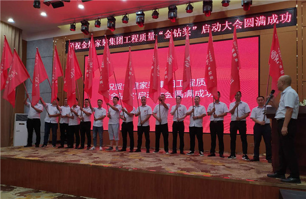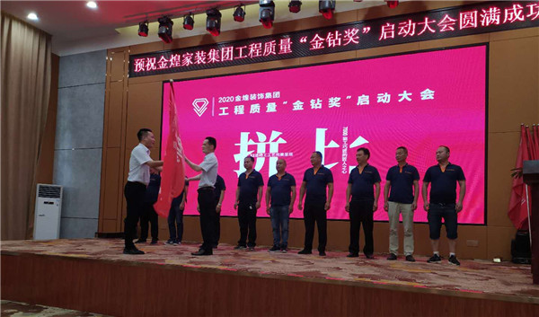 金煌装饰集团董事长号召全体参会人员,以“比敬业之心、比做事匠心”“拼32道精工工艺落地”“管工地形象、管安全到位”的金钻奖评奖规则为指引,把每个工地都打造成为“金钻奖”样板工地!